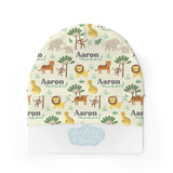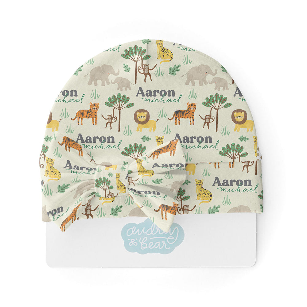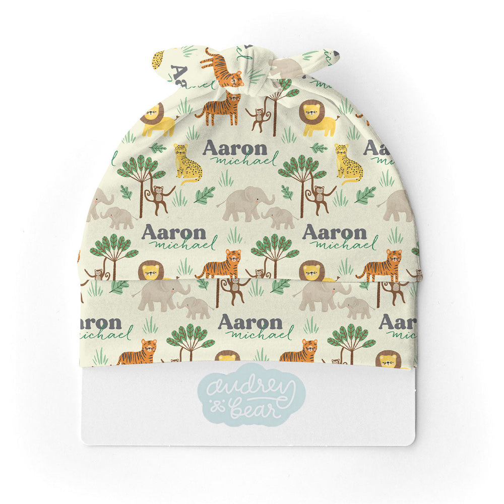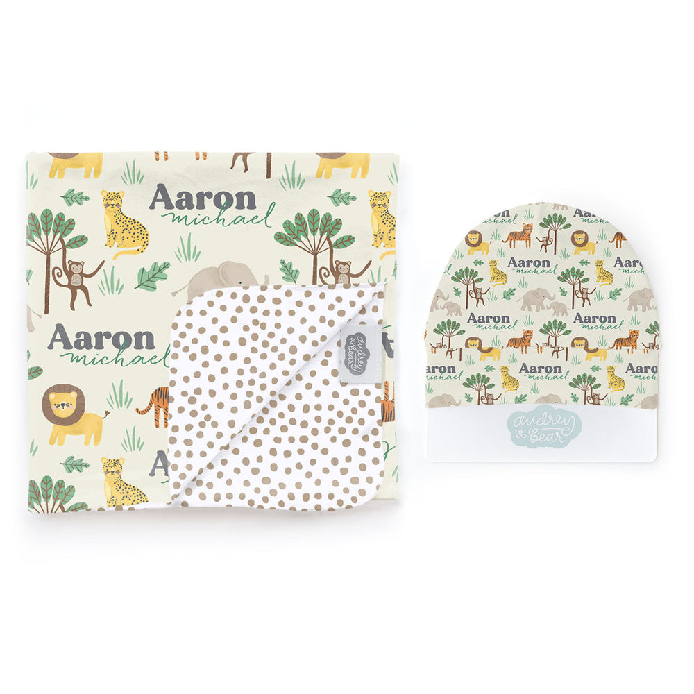 Our personalized swaddle blankets are the perfect combination of soft and stretchy. Each is designed to create a very womb-like experience for baby as they transition to life after birth, meaning a tight swaddle with enough stretch to wiggle around and remain comfortable. Each of our personalized hats or headbands are handcrafted with the most buttery soft and stretchy fabric. Match your hat or headband with the perfect personalized swaddle to create a beautiful first swaddle set for gorgeous pictures and amazing comfort. At Audrey & Bear we use premium fabrics and each of our luxury swaddle blankets and hats are printed, cut and sewn in our production studio in the USA. We use only the best fabrics and materials that have been tested and are safe for baby’s sensitive skin. A personalized swaddle blanket and hat is a unique and easy way to introduce your baby’s name to your family and friends!