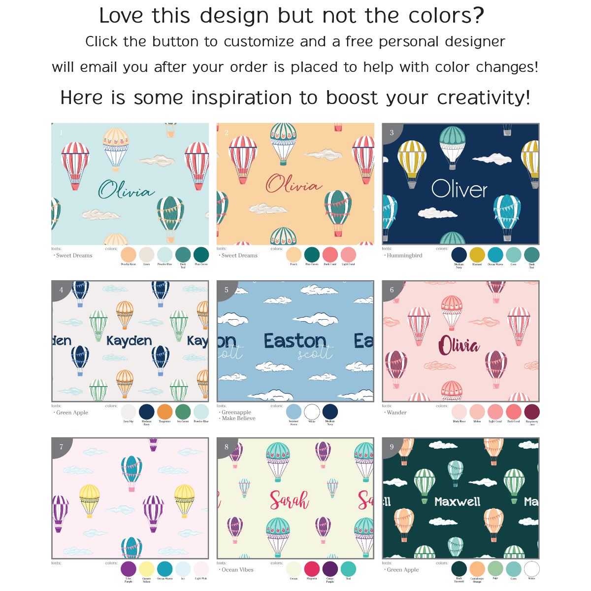 At Audrey & Bear, we specialize in customizing the fonts and colors in all of our designs to match your style. Each design now comes with 9 unique customization options for you to choose from. Once you make your selection and place your order, your customized design goes straight into production!